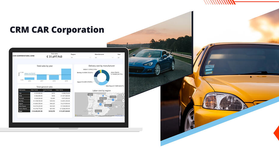 This project involved the development of an interactive dashboard for CAR Corporation International, a luxury car dealership based in Madrid.Objectives:The General Manager was going to present the sales team’s results to the company’s new CEO and needed your help to build a dashboard that represented sales data from 2016 to 2019.The General Manager requested the following:Total sales by yearVehicle delivery costs by manufacturerLabor costs by region or provinceTotal general sales and sales matrixAdditionally, the CEO wanted to visualize total sales by region.Challenge: